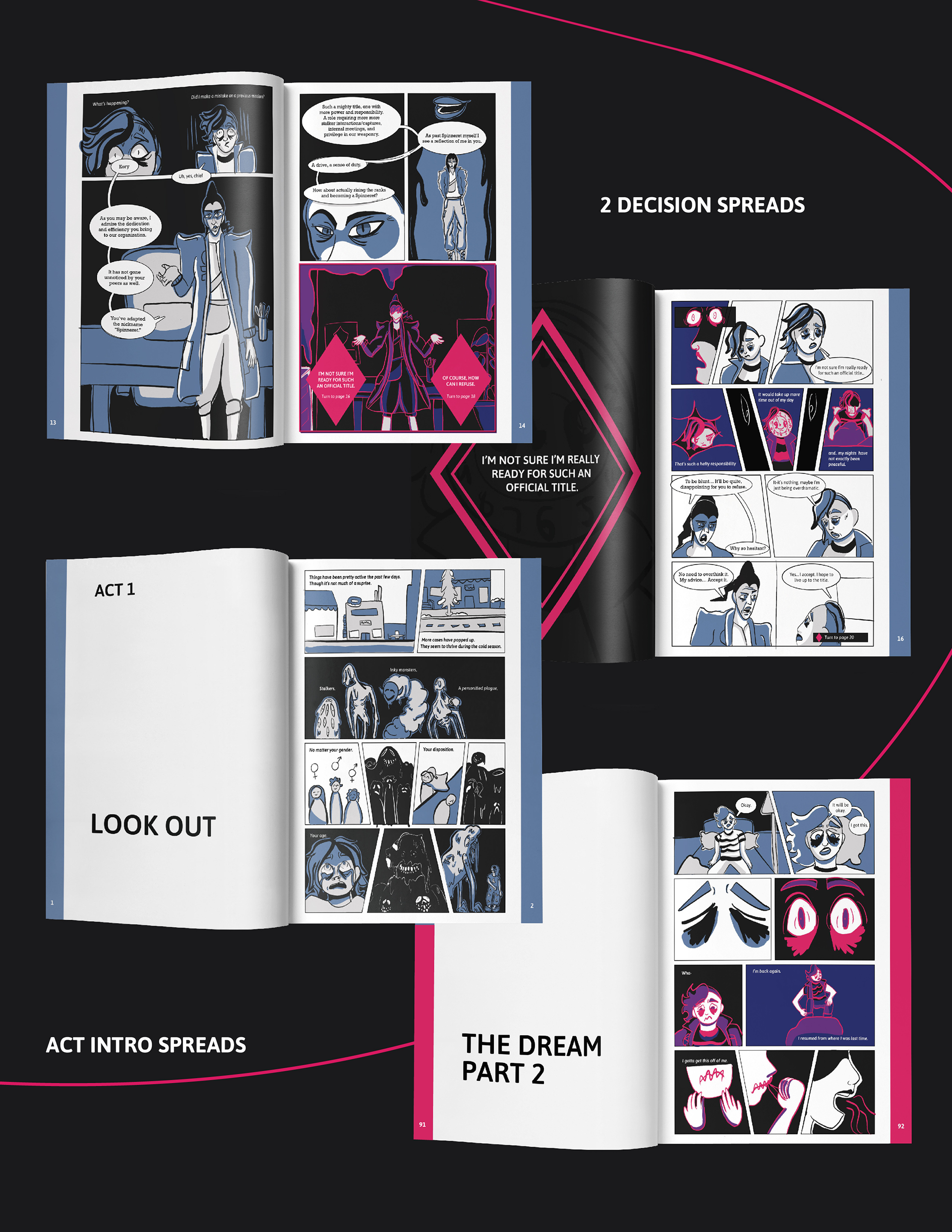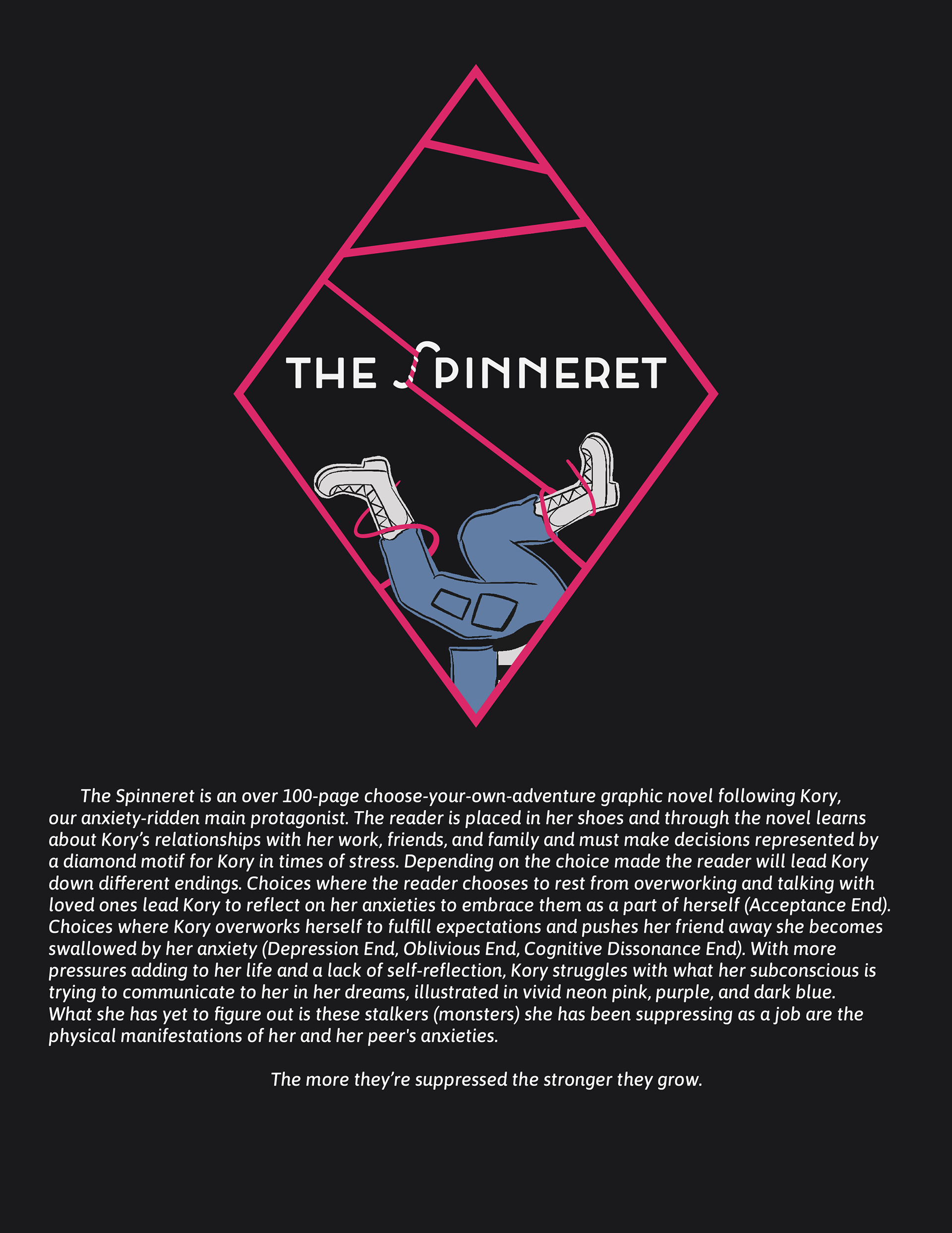 For my thesis project, I decided to expand on my interest in emotional narratives. I created an over 100-page concept for a choose-your-own-adventure graphic novel, The Spinneret. It was not only a passion project in illustrative work but story-wise since the content of my novel contains topics of anxiety and feelings of insufficiency. The process of building my vision in my spring semester was a journey within itself as I wrote my own script, composed the panels on each page, sketched draft illustrations, and then finalized them with ink and coloring in Procreate. A portion of the book was printed while a digital version was shown containing 2 of the 5 endings for my thesis. I also laid out a mobile version of the first part of my book for viewers to preview. Below are pieces of my graphic novel along with a short clip of the mobile version of the novel.